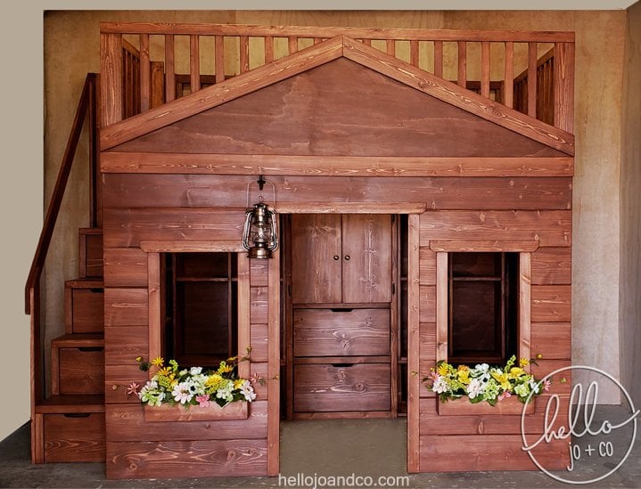 This listing includes the solid wood playhouse bed with extra height crib style railing, drawer storage stairs, under bed storage with cubbies, market bins, cabinet & drawers. Listing also includes finish of 2 custom PPG paint colors.